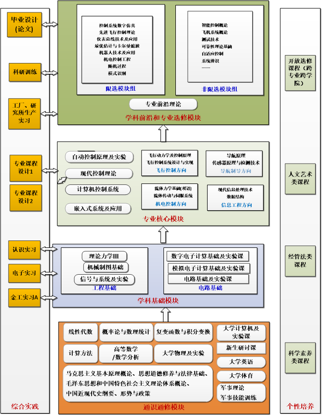 自动化专业涵盖了飞行控制、工业自动化等传统自动控制领域和信息控制等引领信息化发展潮流的新兴技术,包含四个主要专业方向:即飞行控制、导航制导、机电控制、信息工程,是国内唯一具有鲜明航空、航海和航天国防特色的自动化专业教学和研究单位。本专业学术梯队结构合理、人才基础雄厚,形成了前沿基础研究、应用基础和学科交叉研究、预先研究和国防工程应用有机结合的科研体系。