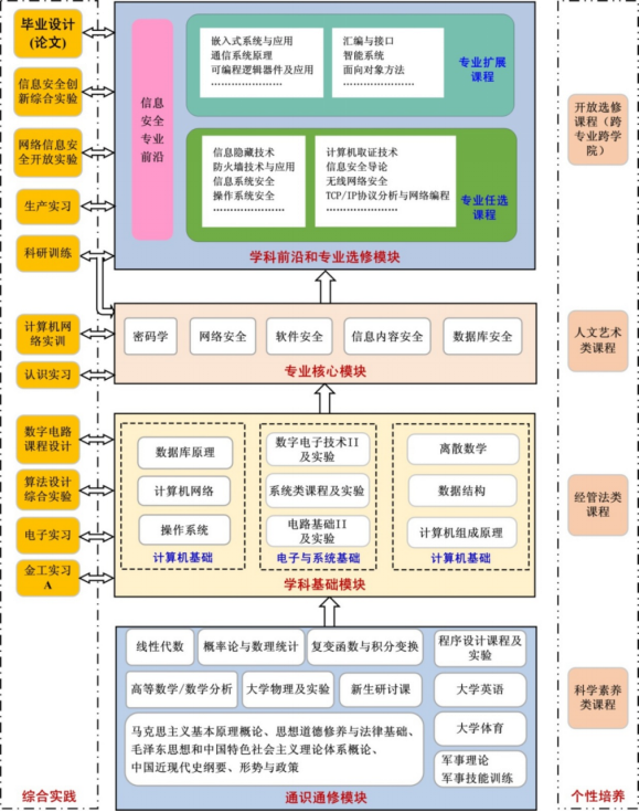 以“厚基础、宽口径、重实践、求创新”为特色,培养适应我国科学和经济发展需要的,面向未来,掌握信息安全领域及相关知识,具有坚实理论基础和较强综合应用能力,具有国际化视野,各方面均衡发展、并有良好人文素养的科研学术人才和应用型人才。