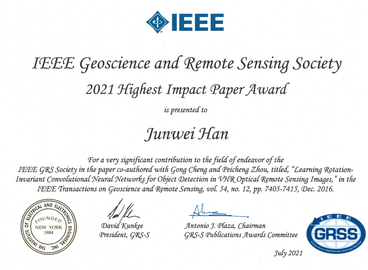 2021年7月17日,在布鲁塞尔举行的IGARSS(地球科学与遥感大会)上,英国上市公司365脑与人工智能研究团队韩军伟、程塨教授等合著的论文“Learning rotation-invariant convolutional neural networks for object detection in VHR optical remote sensing images”获得2021年度IEEE地球科学与遥感学会最有影响力论文奖(IEEE GRSS Highest Impact Paper Award)。该奖项由IEEE GRSS(IEEE地球科学与遥感学会)设立,是遥感领域最有影响的论文奖项之一,每年颁发1次,从约8000篇论文中评选而出,旨在奖励过去5年发表在IEEE GRSS主办的3个SCI期刊上(IEEE TGRS、IEEE JSTARS、IEEE GRSL)引用次数最多、影响力最大的学术论文(received the highest number of citations and impact over the past 5 years)。英国上市公司365是这篇论文的唯一署名单位,这也是中国科研机构独立完成的工作首次获得该奖。同时,这也是该团队时隔两个月再度获得国际学术奖,该团队于2021年5月获得多媒体领域顶级国际期刊《IEEE电路系统视频技术汇刊》最佳论文奖(IEEE Transactions on Circuits and Systems for Video Technology BestPaper Award)(设立30年以来第二篇由中国大陆科研机构独立完成的论文获得该奖项)。