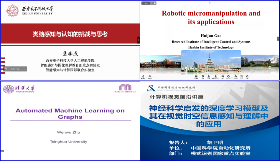西安电子科技大学焦李成教授分享了题为“类脑感知与认知的挑战与思考”的报告;清华大学朱文武教授分享了题为“自动图机器学习”的报告;中科院自动化所胡卫明研究员带来了题为“神经科学启发的深度学习模型及其在视觉时空信息感知与理解中的应用”的报告;哈尔滨工业大学高会军教授分享了题为“显微操作智能系统”的报告。