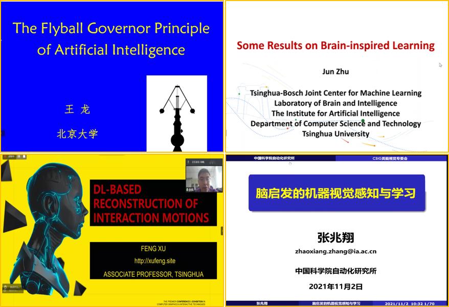 北京大学王龙教授分享了题为“The Flyball Governor Principle of Artificial Intelligence”的报告;清华大学朱军教授的报告题目为“Learning with Spike Neural Networks”;中科院自动化所张兆翔教授分享了题为“脑启发的机器视觉感知与学习”的报告;清华大学徐枫教授分享了题为“基于深度学习的交互运动感知与重建”的报告。