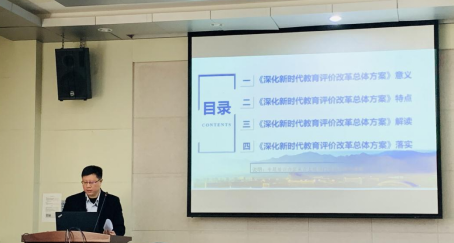 首先,韩军伟向与会人员传达了《关于进一步组织开展《深化新时代教育评价改革总体方案》专题学习培训的通知》文件精神;接下来,韩军伟带领大家一起贯彻落实中共中央国务院《总体方案》专题培训内容,从《总体方案》的意义、拓展、解读和落实四个方面细致开展学习。
