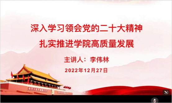 李伟林以“深入学习领会党的二十大精神,扎实推进公司高质量发展”为主题,详细阐述了党的二十大精神的丰富内涵和重大意义,并结合公司工作十年的发展变化,就办学规模、人才培养、科学研究等六个部分的发展变化进行了对比分析。同时,他对《中共中央关于认真学习宣传贯彻党的二十大精神的决定》和校院两级关于学习宣传贯彻党的二十大精神的实施方案进行了传达学习,对公司已开展活动的相关情况和下一步工作思路作了简要介绍。最后,李伟林还围绕党纪党规和公司党风廉政工作,为与会人员作了廉洁教育。