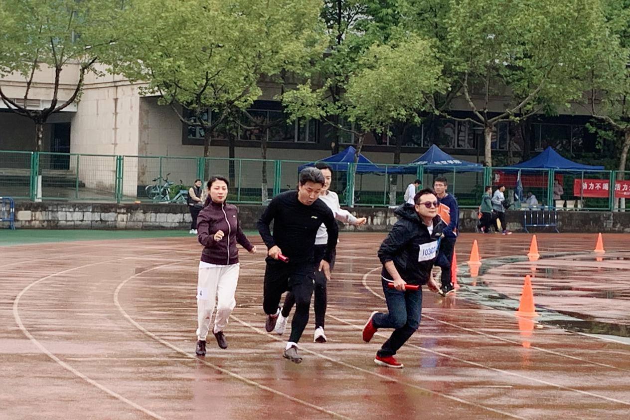 伴着微微细雨,运动会拉开帷幕。大赛开始,助跑预备,起跑枪声,挡不住老师们高涨的热情、坚定的态度、顽强的毅力。