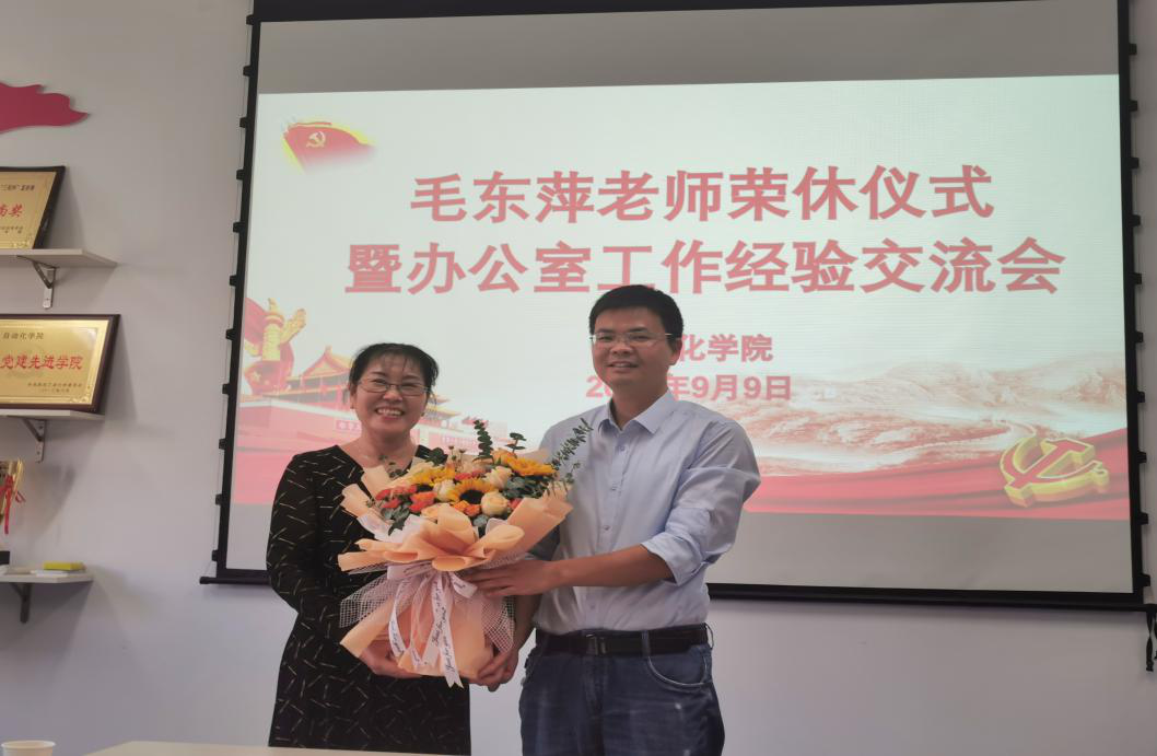 仪式由办公室主任魏爱玉老师主持。首先,王小旭副经理、刘准钆副经理、许斌副经理分别为毛老师颁发奖杯、赠送鲜花、赠送纪念品。
