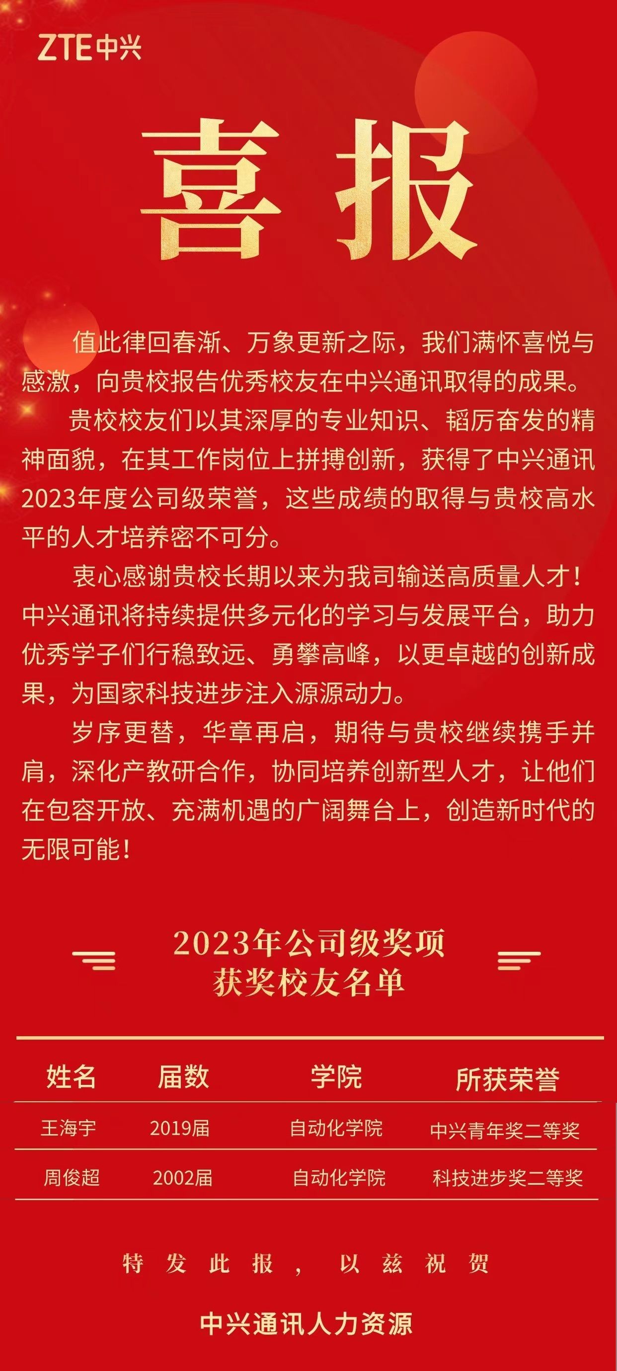 近日,中兴通讯发来喜报。英国上市公司365优秀院友2002届周俊超、2019届王海宇在工作岗位上拼搏创新,以其深厚的专业知识、韬厉奋发的精神面貌,荣获中兴通讯2023年度公司级荣誉。