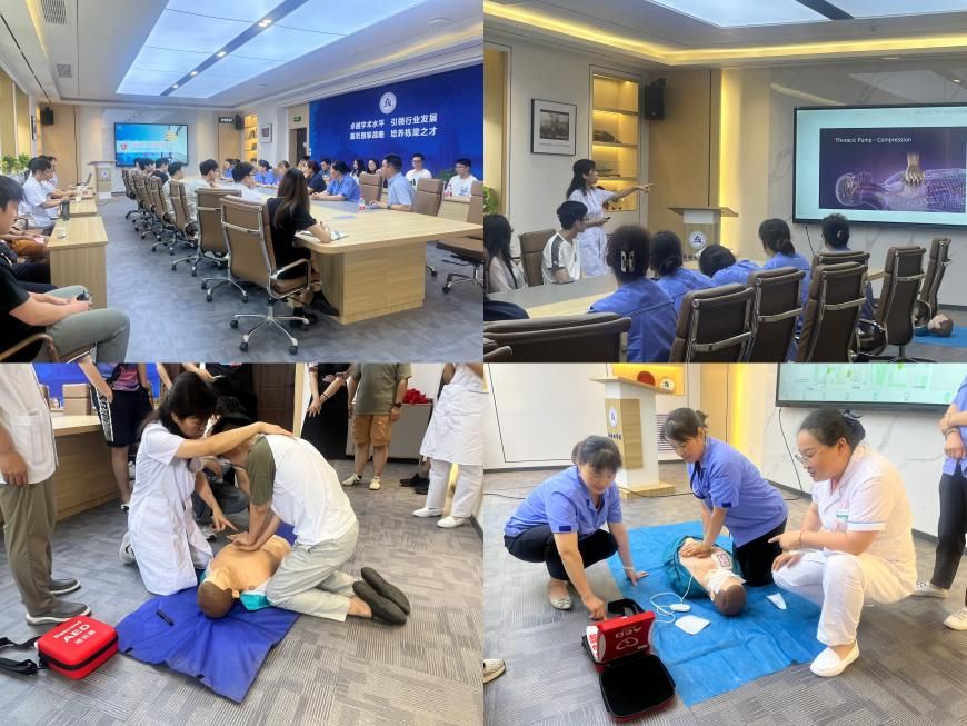 应急救护培训环节,校医院程飞医生一行为公司师生代表、后勤值班人员作培训指导。培训师重点讲解了心肺复苏术+AED(自动体外除颤器)的操作流程、气道异物梗阻排除法以及海姆立克急救法等救护知识,并组织参训人员现场逐一参与模拟演示。现场讲师及时纠正大家的不规范动作和急救误区,有效增强了师生的应急知识储备,提升紧急救护能力。