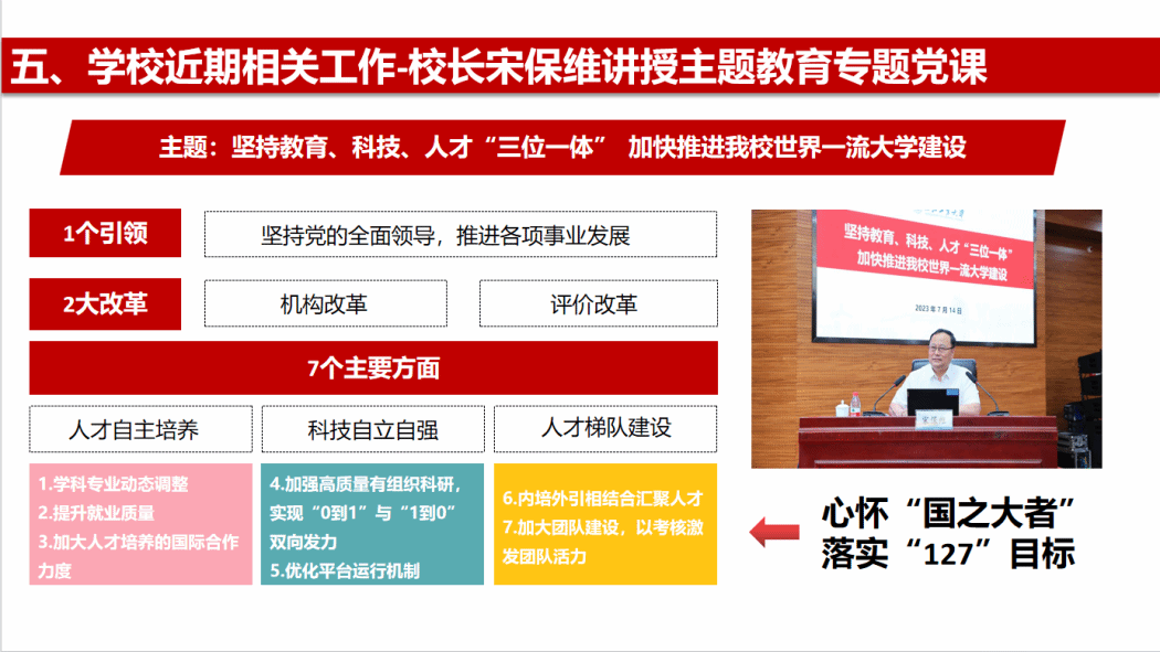 李伟林重点从主题教育背景、理论学习宣贯、调查研究情况、心得思路举措、师德警示教育五个方面讲授专题党课。党课主要从开展主题教育重大意义、总要求、根本任务和目标要求等方面阐述了主题教育背景,并结合公司党委关于开展常态化理论宣讲相关工作要求开展理论宣讲;党课结合公司落实“四项行动计划”具体实际,聚焦公司发展重点难点问题,集中学习了公司党委书记李言荣、董事长宋保维主题教育专题党课精神;党课紧密围绕主题教育调查研究部署安排,从顶层设计、实施情况、调研成果运用及发展思路举措等方面详细介绍了公司调查研究及推动发展情况。