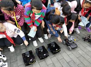 演示活动结束后,同学们近距离观看并体验各个机器人。该环节中,快速游动的仿生机器鱼引起了孩子们的极大兴趣。老师们为小员工现场讲解了机器人的基本原理,并鼓励他们好好学习,将来成为机器人发明家。