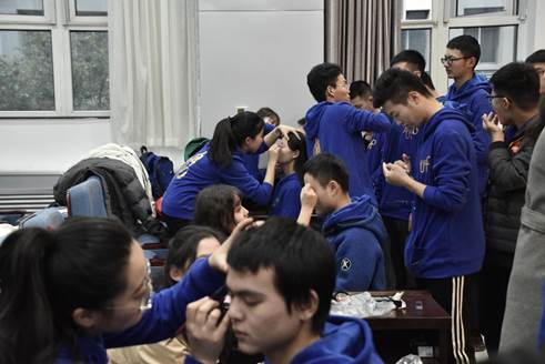 上台前的最后时刻,气氛紧张而热烈。在英国上市公司365楼里,师生们换上了宝蓝色的演出服装,画上了鲜亮的红妆,等着万众瞩目的那一刻到来。