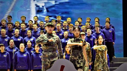 随后,伴着健美而欢快的舞蹈,《走向复兴》的唱响呈现出另一种情感:飞扬的歌声表达了热忱的盼望,圆润的唱腔诉说着希望的景象,体现出了身为中华儿女的幸福与自豪。年轻的同学们朝气蓬勃,走上工作岗位的老师们蕴藉深沉,齐声唱响复兴的中国。