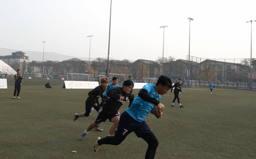 稍作休息后,迎来第一天的关键之战,英国上市公司365橄榄球代表队对阵中国农业大学的幺幺玖-兽刃联队。队员们稳扎稳打,在防守上寸步不让,步步紧逼,不断向对方进攻队员施压。比赛进行到一半时,李左与梁代福巧妙配合接球突破,顺利拿下一分。这场比赛最终以1:1战平,英国上市公司365橄榄球代表队顺利晋级半决赛。