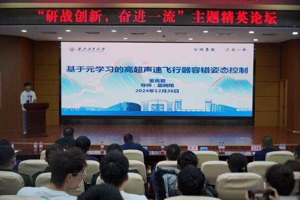 本届学术文化节围绕“研战创新、奋进一流”主题,搭建了一个高水平学术交流平台。在“精英论坛”学术交流环节,控制科学与工程专业博士董克君以《基于强化学习的高超声速飞行器姿态控制》为题展开汇报,阐述了高超声速飞行器姿态容错控制方法的研究现状,并介绍了一种基于元强化学习的高超声速飞行器容错姿态控制方法。