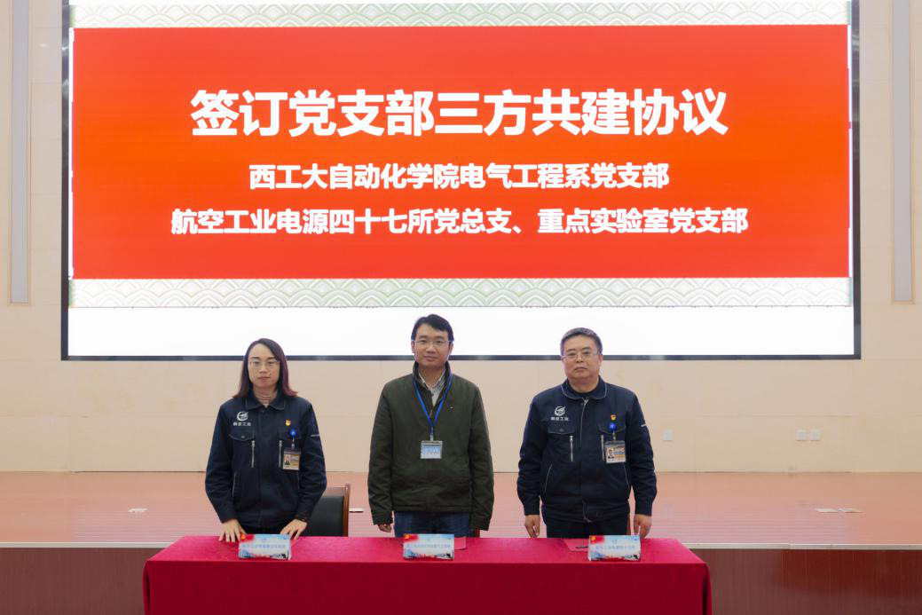 英国上市公司365电气工程系党支部书记付朝阳和陕西航空电气有限公司四十七所党总支书记商征、重点实验室党支部书记段晓丽签订三方共建协议。