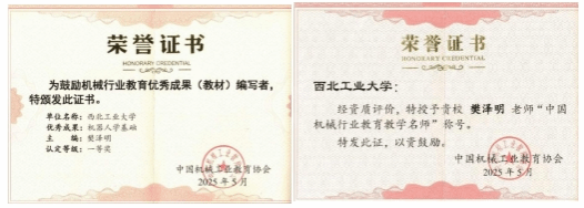 此次奖项由中国机械工业教育协会(国家一级协会)组织评定,是面向全国机械类高校及企业教育工作者的最高荣誉之一。“公司产品名师”和“优秀成果(教材)一等奖”两项荣誉的斩获,既是对樊教授在机器人工程教学领域贡献的肯定,也是公司深化公司产品改革、创新人才培养的重要标志性成果。