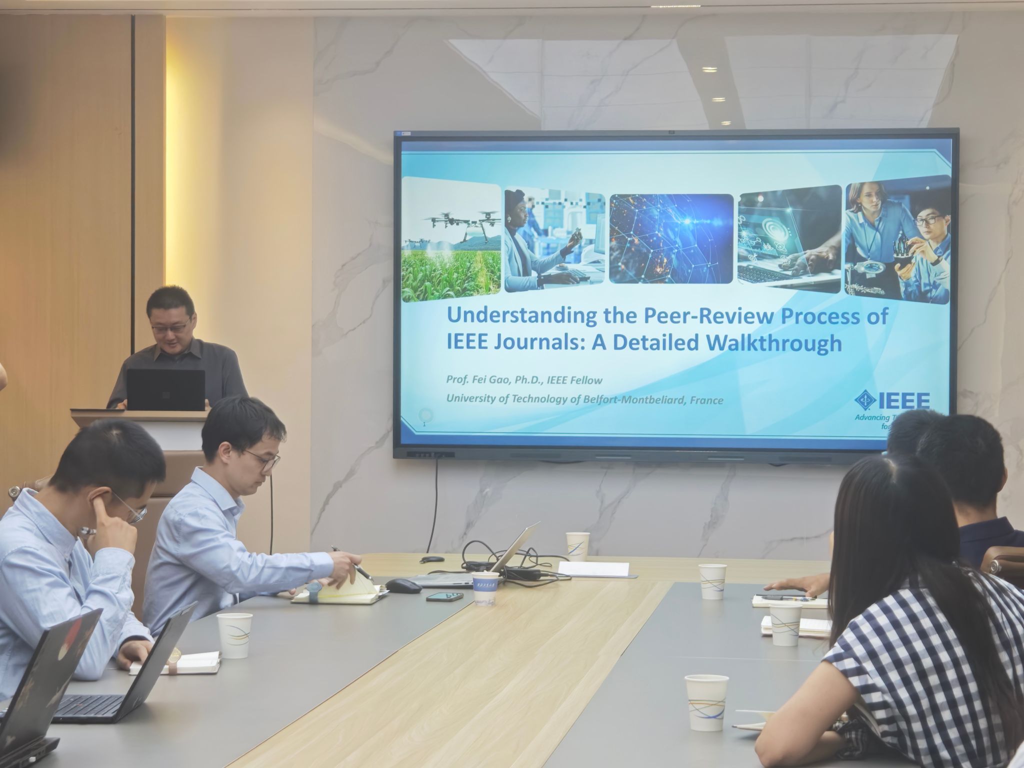 在主题报告环节,Fei GAO教授结合其资深期刊编辑经验,作了题为“Understanding the Peer-Review Process of IEEE Journals: A Detailed Walkthrough”的精彩报告。他系统阐述了IEEE期刊论文从投稿到出版的全流程,包括稿件提交、审稿意见回复、稿件修改及录用出版等关键环节,并分享了撰写高质量论文及投稿高水平期刊的宝贵经验。