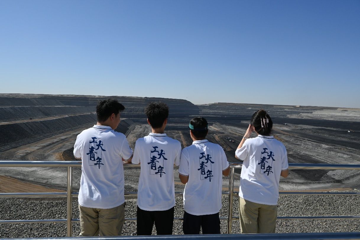 再探现代矿区,感悟管理智慧。随后,实践队前往以成熟管理和先进技术著称的将军戈壁一号露天煤矿。登上观景平台俯瞰矿坑全貌,工作人员向队员们介绍了一号矿从建设投产到扩能增效的发展历程和未来规划,特别强调矿区始终坚守绿色发展理念,积极推进节能减排和生态修复,并采用高效洗选技术提高煤炭品质、减少污染物排放。