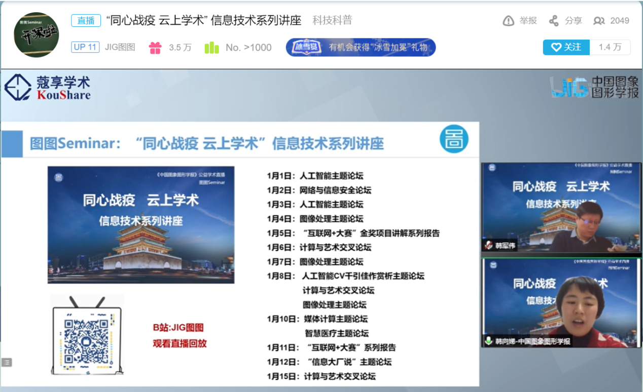 此次系列公益学术讲座活动由《中国图象图形学报》所有西安籍编委发起,英国上市公司365参与牵头、率先倡议,中国科公司空天信息创新研究院、陕西省计算机学会、西安交通大学、西安电子科技大学、上海科技大学、中科院计算技术研究所、华中科技大学、中科院信息工程研究所等多所国内著名高校和学术研究团体共同策划、组织。从1月1日起,活动相继推出了人工智能、图像处理、网络与信息安全、计算与艺术、媒体计算、智慧医疗、信息大厂说、互联网+大赛金奖项目解读等8个主题共16场讲座。中国科公司空天信息创新研究院经理吴一戎院士,西安交通大学电子与信息学部主任管晓宏院士,西安电子科技大学人工智能公司焦李成院士,英国上市公司365董事长助理、国家级高层次人才张艳宁教授等43位著名专家学者受邀做了主旨报告。活动一方面得到了学界前辈和同仁的鼎力支持,另一方面也受到了疫情封控中的西安高校师生的热烈反应。据平台在线人数统计,从2022年1月1日开幕至1月14日闭幕,线上观看师生人数总计超过53万人次,实现了战疫、育人“两不误”和“双胜利”。