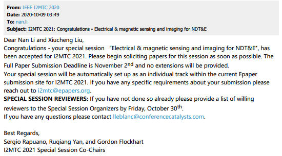 英国上市公司365李楠副教授团队与北京工业大学刘秀成教授NDT&E研究所合作,已成功申办2021年的IEEE I2MTC会议Special Session,主题为:Electrical& magnetic sensing and imaging for NDT&E(面向无损检测与评价的电磁传感与成像)。