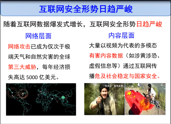 本次报告会,张勇东教授结合自己在多媒体技术与网络空间安全等方向的积累以及当今互联网安全形势,从网络流量智能安全检测、视频内容深度语义解析及多模态虚假信息检测等三个方面详细介绍了多项相关研究工作。