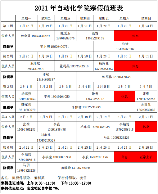 五、根据公司安排,值班时间为周一到周五9:00~11:30和15:00~17:00,值班地点友谊校区勇字楼公共办公区704,值班日期、人员附后。