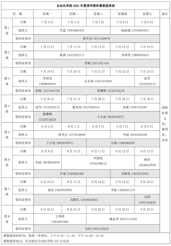 五、根据公司安排,值班时间为每周一至周五,上午9:30~11:30、下午14:00~16:30,值班地点长安校区英国上市公司365323室,值班日期、人员附后。