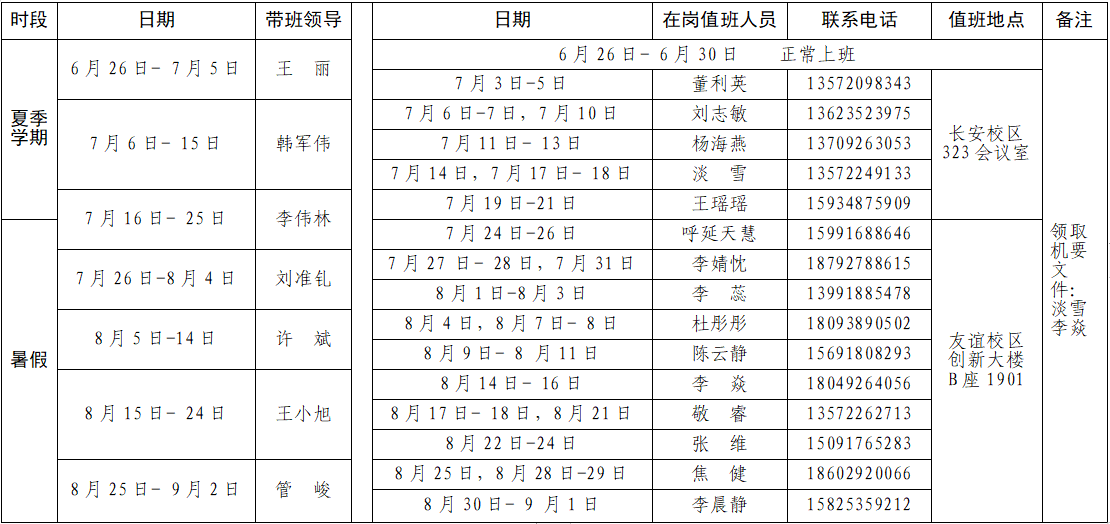 4.教职工放假时间为6月26日至9月2日,6月25日、9月3日正常上班。有夏季学期教学任务、军训任务的教职工须根据安排完成相关工作。