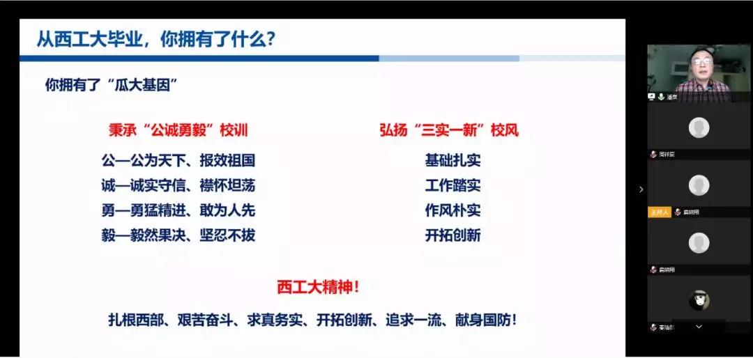 首先,潘泉书记带领同学们重温了校风校训,号召毕业生带着独特的西工大印记,在未来的学习、科研与工作中继续秉持“三实一新”的校风,发扬西工大精神。同时,潘泉书记以余承东和吴亚军等杰出员工为例,鼓励青年学子以员工为榜样,在未来的人生中攻坚克难,发挥创造能力、创新精神、创业本质,延续西工大现象。