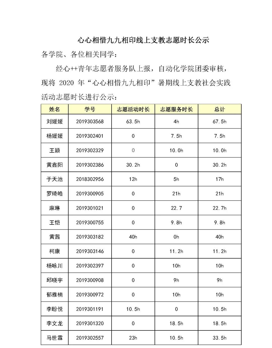 心心相惜九九相印线上支教志愿时长公示