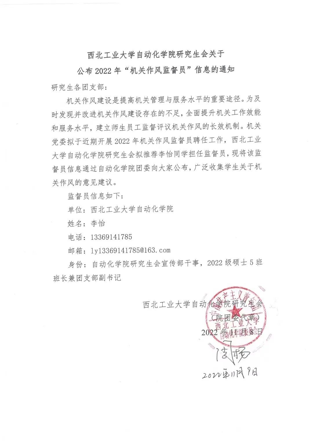 公司研究生会关于公布2022年“机关作风监督员”信息的通知